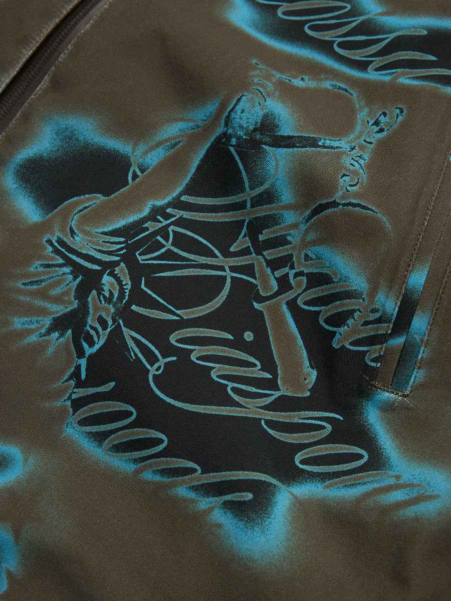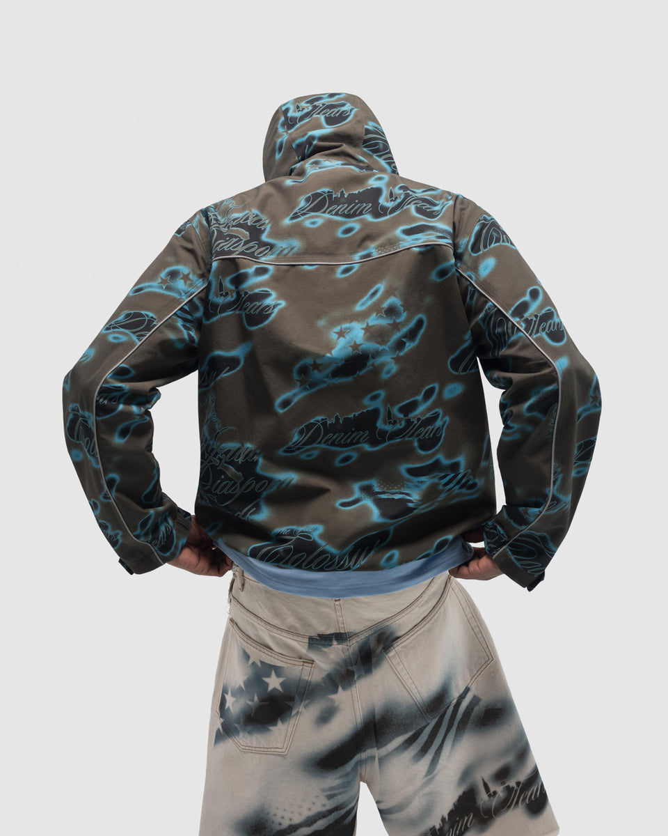 Constructed from a water-resistant 100% Nylon shell, our Cloud Camo Taped Seam Shell Jacket features taped seams and reflective 3M piping, and full Cloud Camo airbrushed print: a graphic amalgamation of key ‘Libertas’ motifs, including the US flag, African Diaspora Goods, and New Colossal.