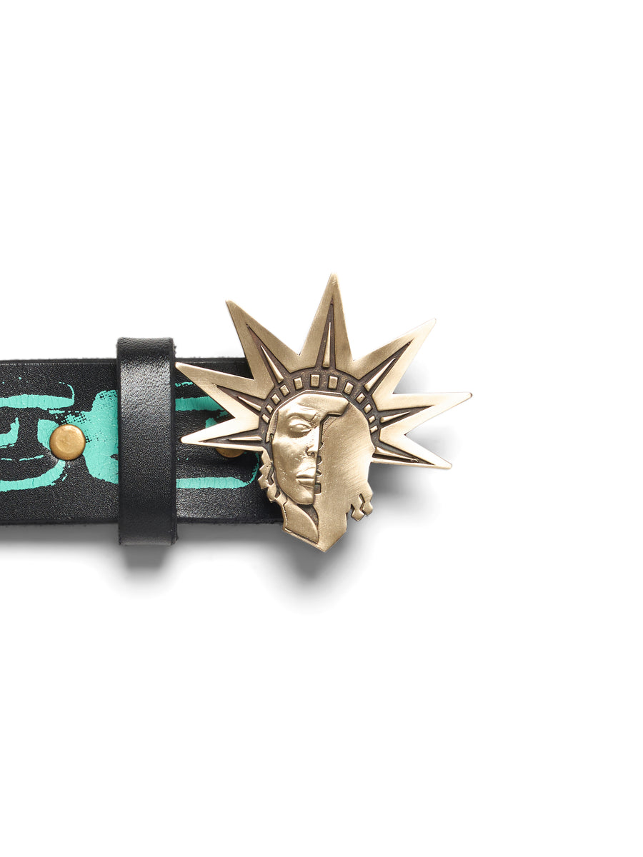 Our Libertas Belt, made in the USA from 10oz full-grain cowhide leather, screen-printed throughout with the broken chain of Lady Libertas, a poignant reminder of African American enslavement and emancipation. Finished with a custom Denim Tears antique brass belt buckle.