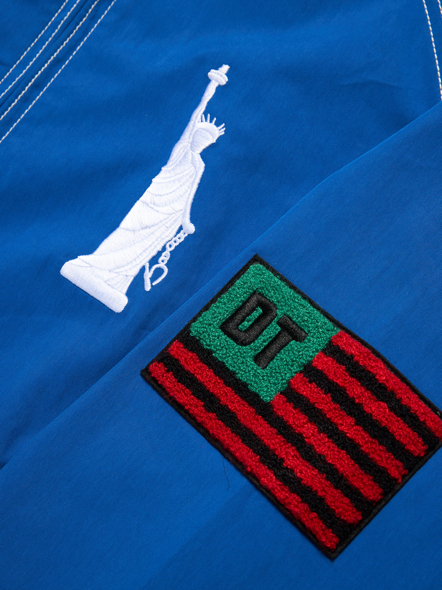 Constructed with a 100% cotton shell and cut to a regular fit, our Libertas Zip Jacket features an embroidered chenille Pan-African American Flag patch and 1886 on the sleeves, and an embroidered Libertas at the chest. Finished with contrast stitching and a custom antique nickel Denim Tears zipp…